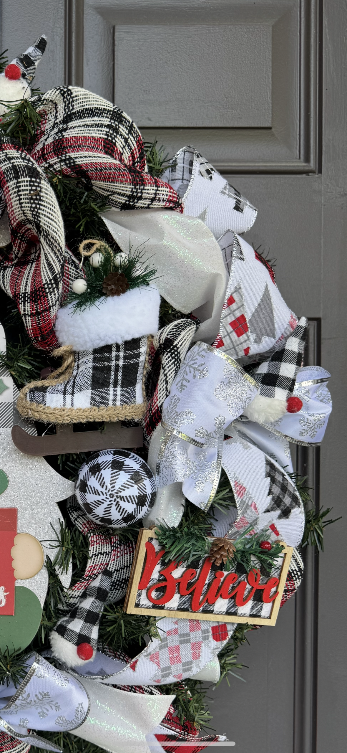 Bring rustic holiday charm to your home with this handcrafted Christmas wreath! Designed with layers of festive plaid ribbons, sparkling white bows, and frosted greenery, this wreath is the perfect blend of cozy farmhouse style and winter magic. Adorned with mini “Believe” signs, buffalo plaid ornaments, snowflakes, and fuzzy plaid boot accents, it’s full of unique details that stand out. At the center, a cheerful “Merry Christmas” sign completes the warm and welcoming look.